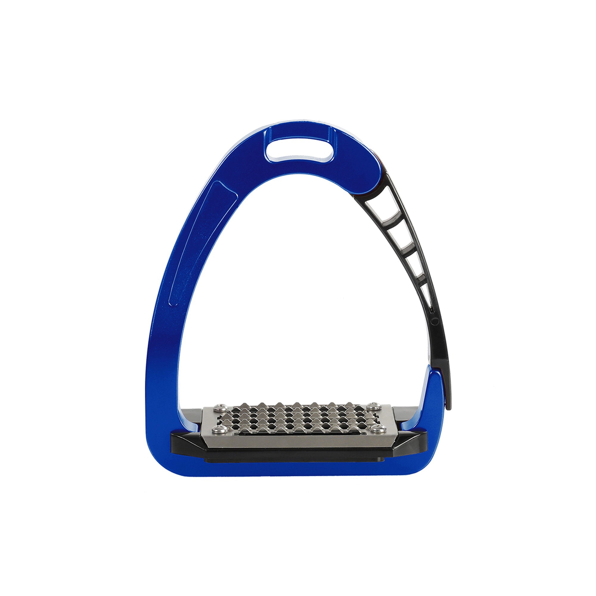 The Acavallo Arena Alupro stirrups are characterized by the new, patented, laterally opening stirrups based on several years of extensive research and development. High-tech combination of metal and polymer materials, produced by means of an innovative, patented injection moulding technique. Due to its design and construction which is based on flexible polymers, the stirrup conveys a less rigid and much more comfortable feeling to the rider than with conventional products.The upper part of the footboard is in stainless steel and is characterized by long horizontal holes that prevent the accumulation of sand and dirt, so as to guarantee an optimal grip in all conditions; stainless steel also protects it from corrosion and therefore guarantees a long product life. The opening of the stress-actuated locking and release mechanism is located a centimeter higher from the tread to ensure that the foot cannot slip out laterally by mistake and to prevent sand and dirt from delaying the opening action of the arm in case of an emergency.